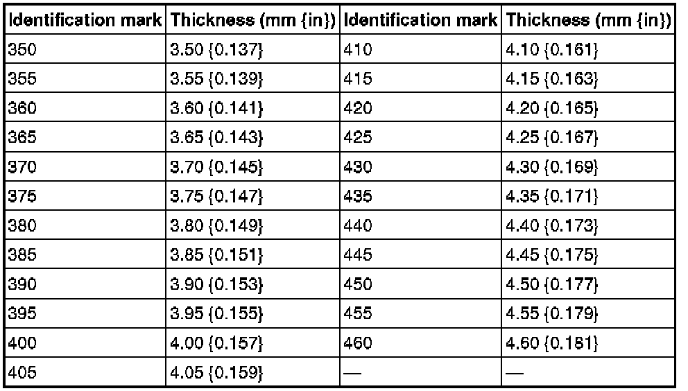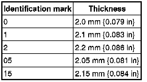 7. If the combined thickness of the previously installed adjusting shims is not between C1 and C2, or if the adjusting shims have to be replaced, select two appropriate adjusting shims from the table below. Adjusting shim thickness