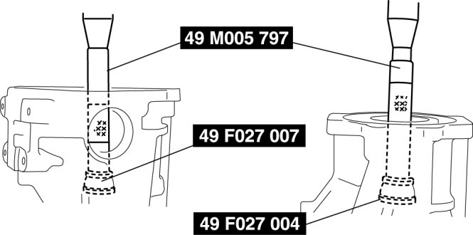 - When moving the gear case component in the axial direction, replace the adjusting shims. If the adjusting shim on the right side is replaced with one that is 0.05 mm {0.002 in} thicker, replace the one on the left with one that is 0.05 mm {0.002 in} thinner.