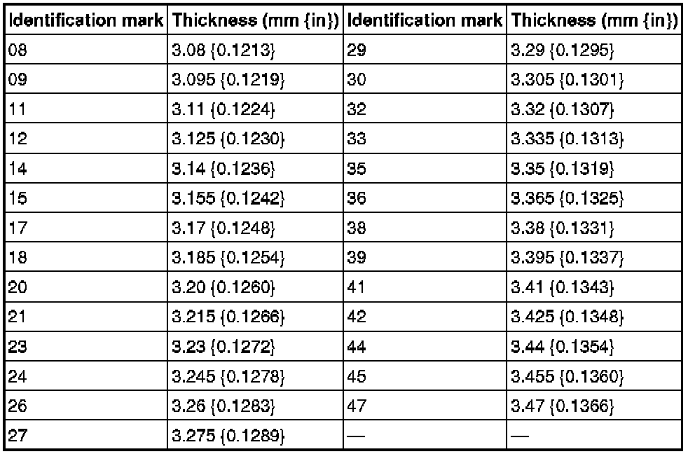Replace with a spacer 0.03 mm {0.001 in} thicker than the currently used one. Spacer thickness is set at 0.015 mm {0.0006 in} increments, therefore select the closest spacer thickness and assemble.
