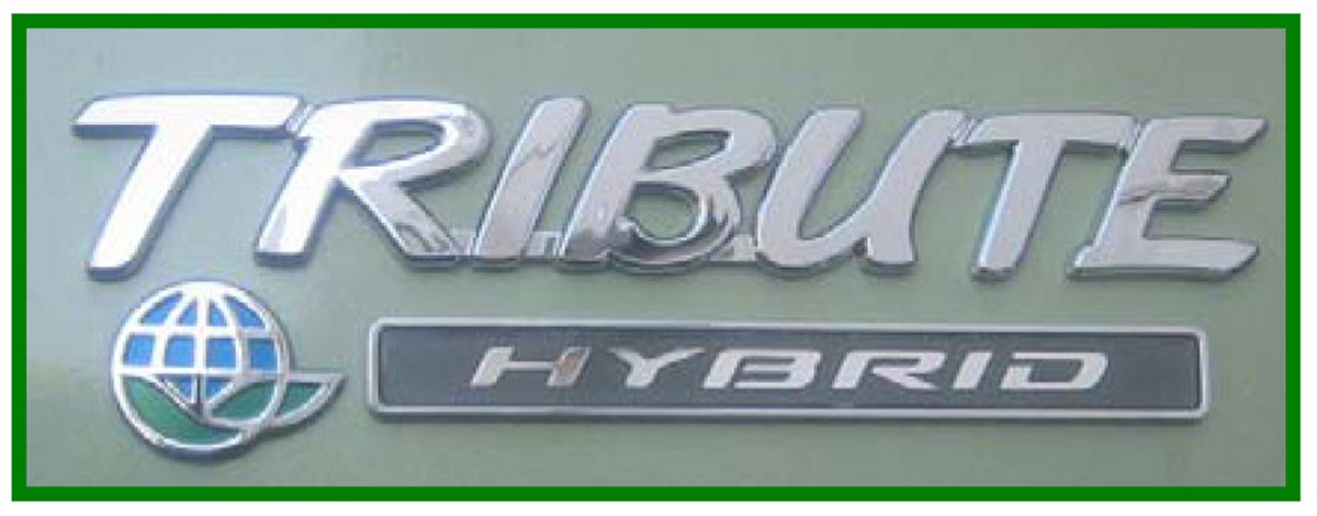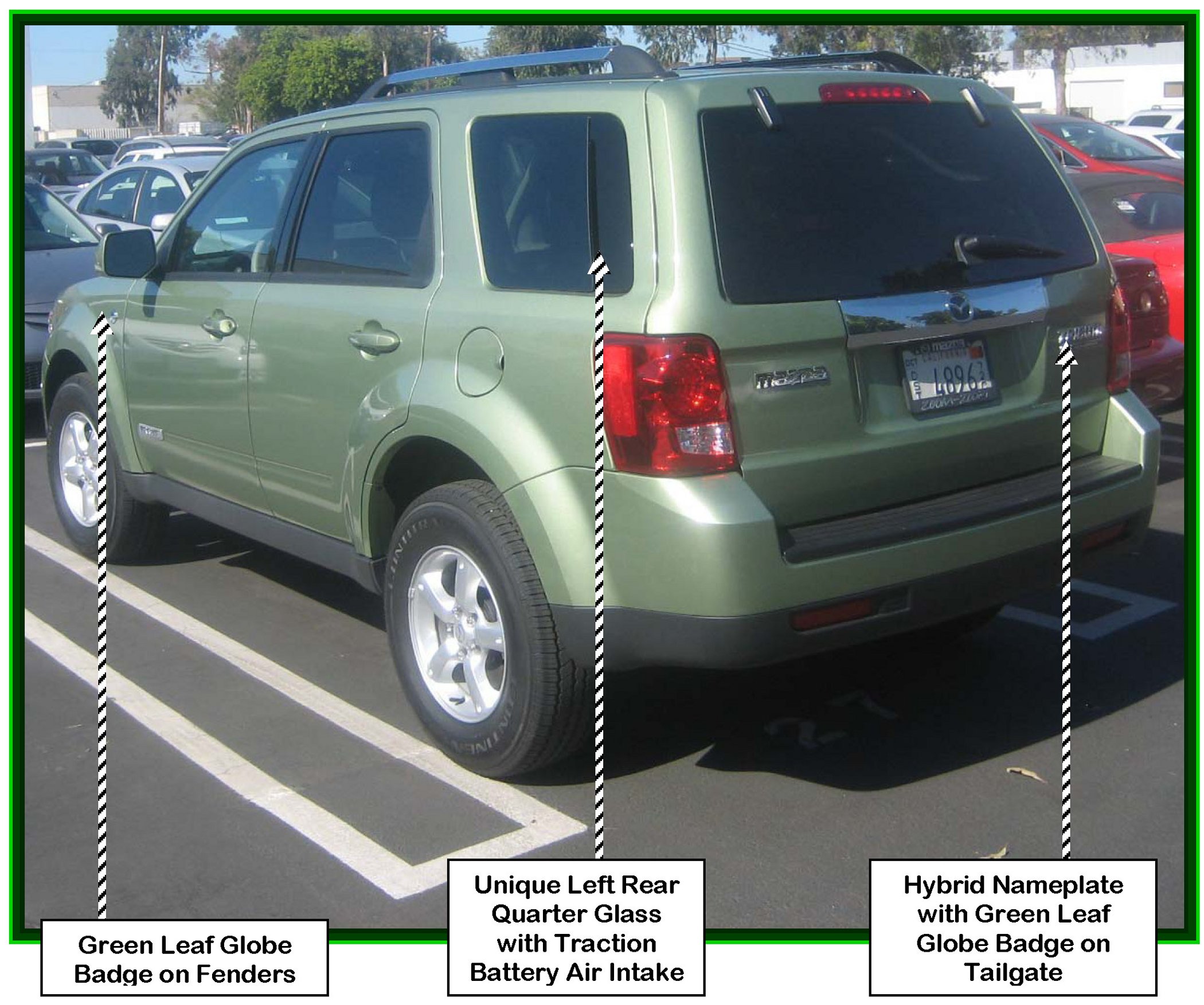 The Tribute Hybrid vehicle can be easily identified by the Mazda green leaf globe badges located on the left and right fenders. There is also a Hybrid name plate on the tailgate that also includes the green leafy icon. The Tribute Hybrid vehicles have a unique left rear quarter glass that incorporates the high-voltage traction battery air intake.