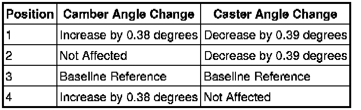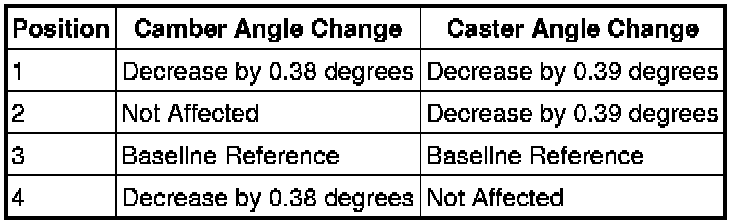 4. Use the following table for LH side camber and or caster adjustment.