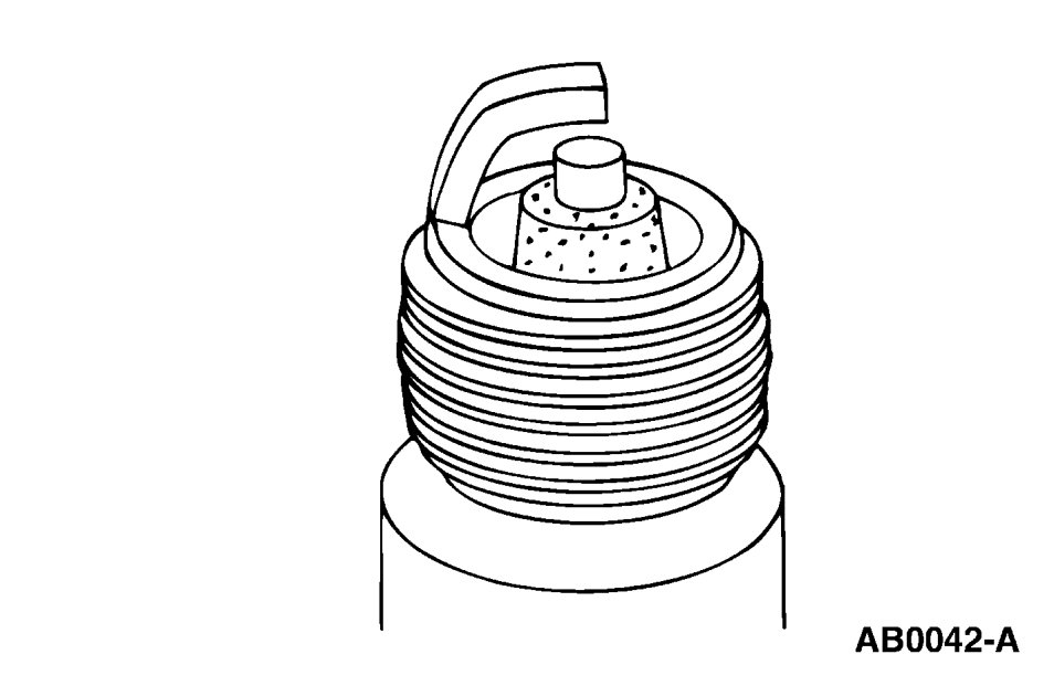 - Check for wet, black deposits on the insulator shell bore electrodes, caused by excessive oil entering the combustion chamber through worn rings and pistons, excessive valve-to-guide clearance or worn or loose bearings.