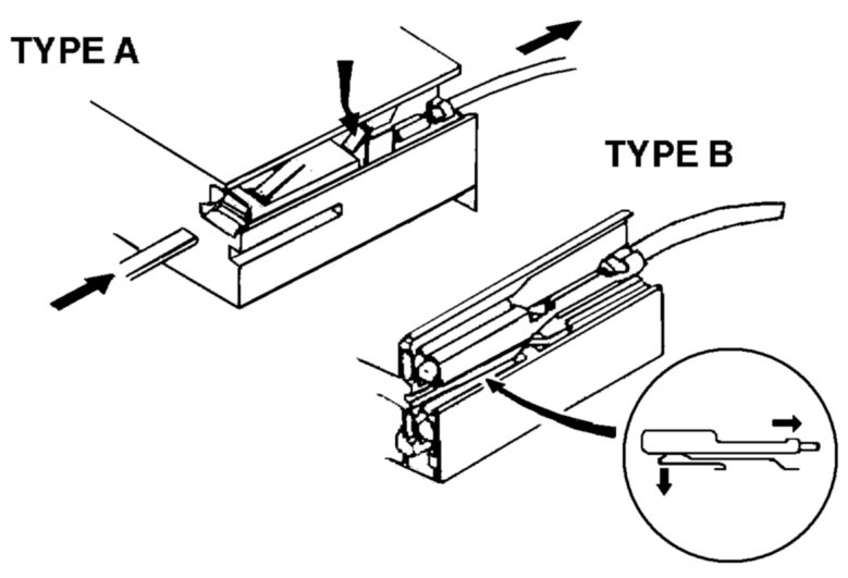 - Insert a thin piece of metal from the terminal side of the connector and with the terminal locking tab pressed down, pull the terminal out from the connector.