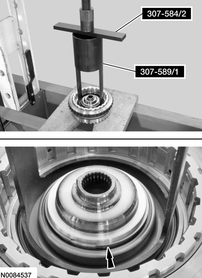 20. Install Overdrive Clutch and Balance Piston Service Set and 2-6 Spring Compressor on the direct (3, 5, R) clutch cylinder. Using a press, compress the direct (3, 5, R) clutch piston return spring, and remove the snap ring.