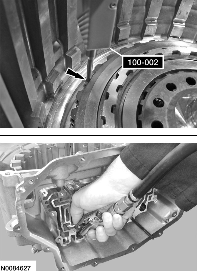 29. Position the O/D/direct clutch assembly in the transaxle case, install Dial Indicator Gauge With Holding Fixture or a suitable dial indicator and position the plunger on the O/D (4, 5, 6) clutch pressure plate. Apply 483 kPa (70 psi) of air pressure to the O/D (4, 5, 6) clutch piston port while recording the clutch pack clearance on the Dial Indicator. The clearance should be between 0.950 mm (0.037 in) and 1.778 mm (0.07 in). If the clearance is out of range, check the O/D (4, 5, 6) clutch pack for correct installation. If the O/D (4, 5, 6) clutch pack is correctly installed, install a new O/D (4, 5, 6) clutch pack.