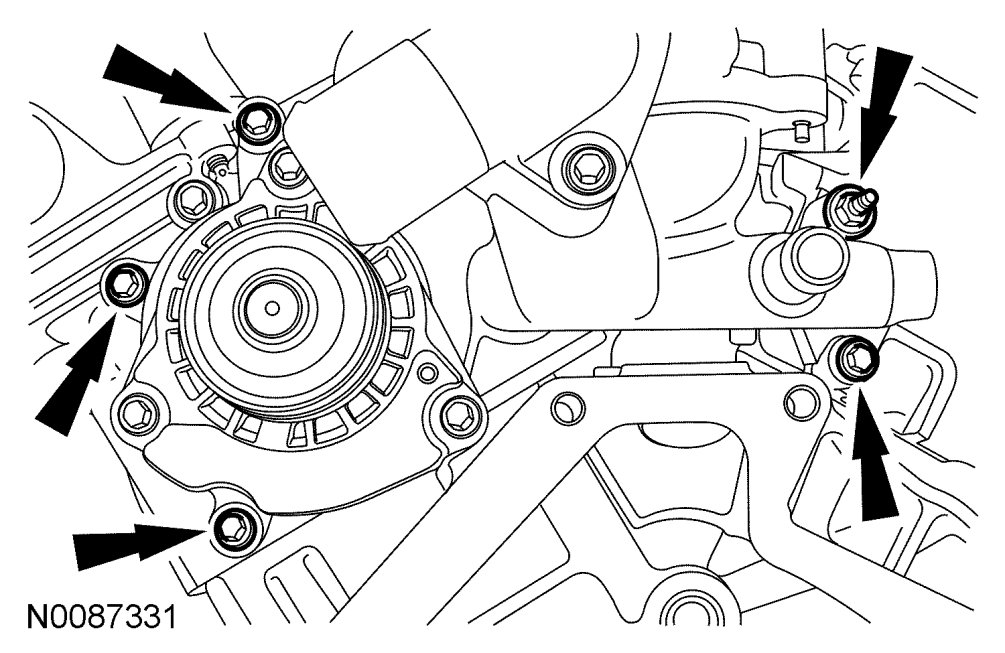 13. Remove the 5 coolant pump housing bolts.