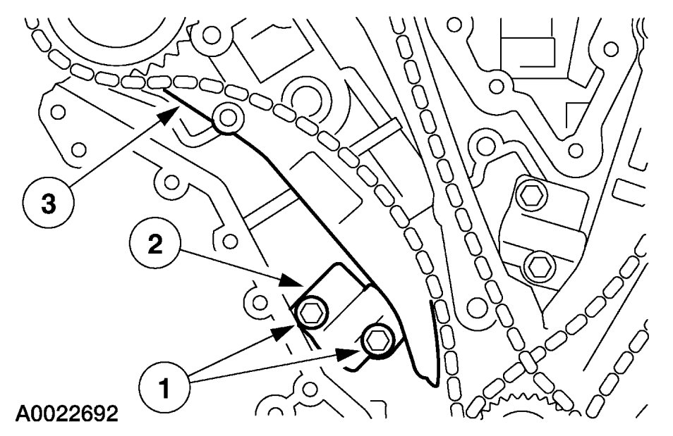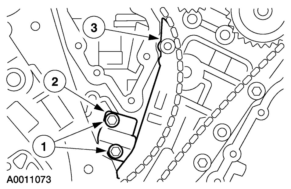 7. Position the LH timing chain and guide and install the bolts.