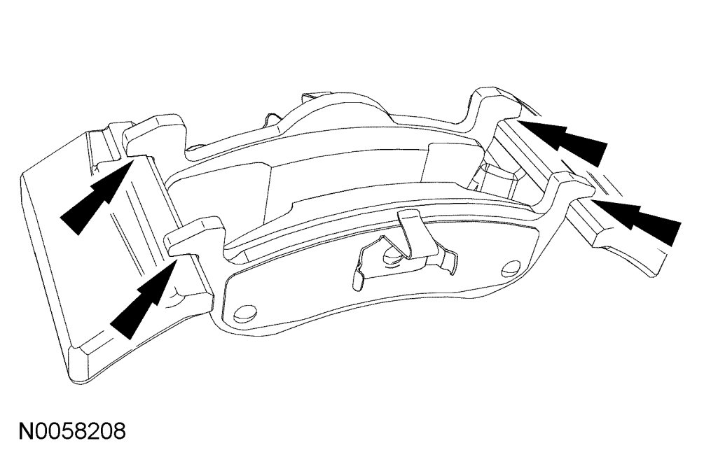 1. Using the specified brake parts cleaner, clean, dry and inspect the brake caliper anchor plate. Apply a light coat of specified lubricant to the 4 brake pad contact points on the anchor plate.