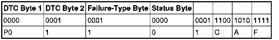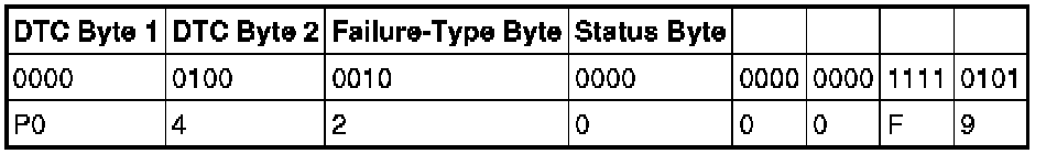 The failure-type byte is designed to describe the specific failure associated with the basic DTC. For example, an failure-type byte of 1C means circuit voltage out of range, 73 means actuator stuck closed. When combined with a basic component DTC, it allows one basic DTC to describe many types of failures.