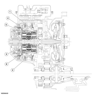The center planetary sun gear is splined to the input shaft and is used as input to the planetary gearsets in 1st, 2nd, 3rd and 4th gear.The center planetary ring gear is splined to the rear planetary carrier and transfers power from the center planetary gearset to the rear planetary gearset in 3rd gear, from the rear planetary gearset to the center planetary gearset in 4th gear and is held stationary by the low one way clutch (OWC) and low/reverse clutch in 1st gear and reverse.The rear planetary carrier is splined to the overdrive (OD) (4, 5, 6) clutch hub and transfers power from the input shaft to the rear planetary carrier in 4th, 5th and 6th gear.