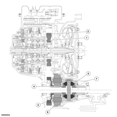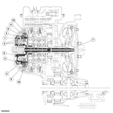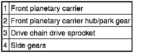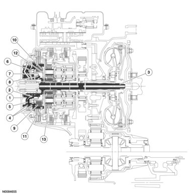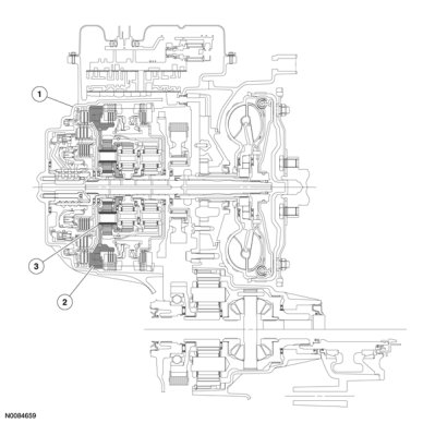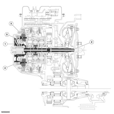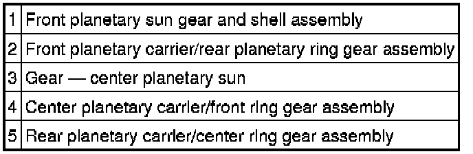 - Rear planetary sun gear and shell assemblyThe front planetary sun gear is splined to the forward (1, 2, 3, 4) clutch and is held stationary in 1st, 2nd, 3rd and 4th gear.The front planetary carrier is splined to the rear planetary ring gear and transfers power from the rear planetary gearset to the front planetary gearset in 2nd, 3rd, 5th and 6th gear and reverse. The front planetary carrier is splined to the drive chain drive sprocket. The front planetary carrier is the output component for the planetary gearset.The front planetary ring gear is splined to the center planetary carrier and transfers power from the center planetary gearset to the front planetary gearset in 1st, 2nd, 3rd and 4th gear.