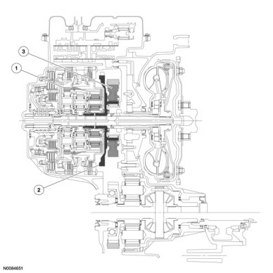 The intermediate clutch is a brake clutch that holds the rear planetary sun gear and shell assembly. The intermediate clutch is applied in 2nd and 6th gear.Hydraulic pressure from the regulator valve in the valve body pushes the intermediate clutch piston against the intermediate clutch pack to apply the clutch. The low OWC works as a pressure plate for the intermediate (2, 6) clutch. The rear planetary sun gear and shell assembly is held stationary to the transaxle case as a result of the clutch being applied.