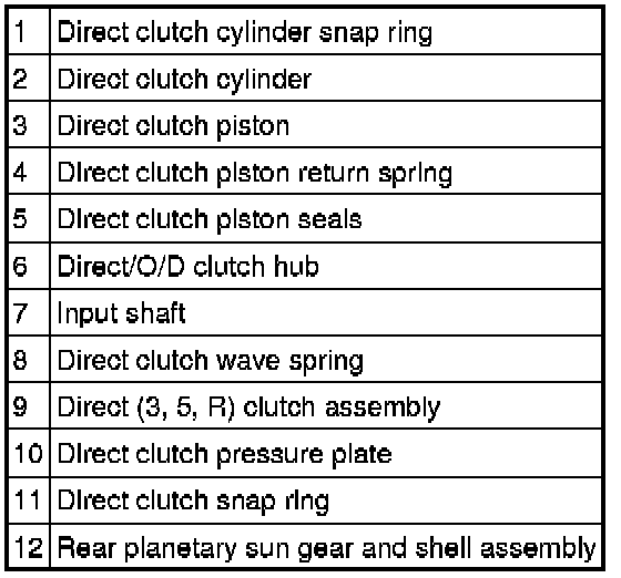 The direct clutch is a drive clutch that transfers power from the direct/O/D clutch hub assembly to the rear planetary sun gear and shell assembly. The direct clutch is applied in 3rd and 5th gear and reverse.Hydraulic pressure from the regulator valve in the valve body pushes the direct clutch piston against the direct clutch pack to apply the clutch. The input shaft and direct/O/D clutch hub assembly transfers torque to the rear planetary sun gear and shell assembly as a result of the clutch being applied.