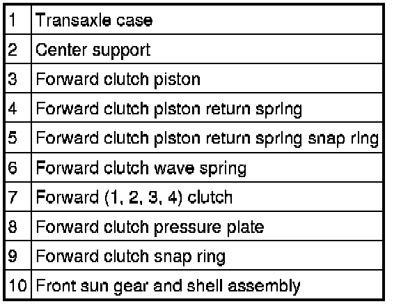 The forward clutch is a brake clutch that holds the front sun gear and shell assembly. The forward clutch is applied in 1st, 2nd, 3rd and 4th gear.