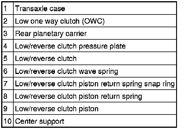 The low/reverse clutch is a brake clutch that holds the low one way clutch (OWC) which is splined to the rear planetary carrier. The low/reverse clutch is applied in manual LOW, REVERSE and 1st gear up to 6 km/h (4 mph).