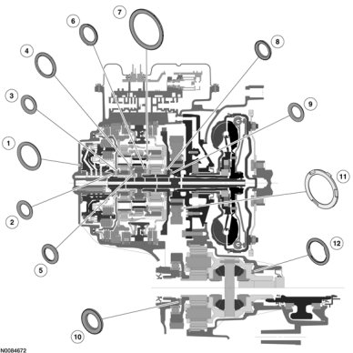 The torque converter housing has a lip-type seal that seals the torque converter hub. The pump assembly seals to the torque converter housing with a rubber seal. The manual shaft and halfshafts also use lip-type seals. All wheel drive (AWD) vehicles do not use a RH halfshaft seal, the transaxle is sealed by the power transfer unit (PTU) on the RH side.The torque converter housing is sealed to the transaxle case with silicone sealant.