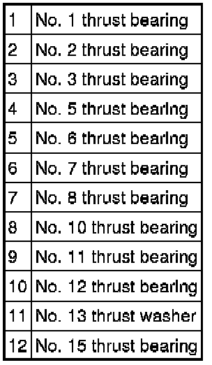 The No. 4 thrust bearing is part of the rear planetary carrier assembly. The No. 9 thrust bearing is part of the front planetary carrier assembly. The No. 14 thrust bearing is part of the differential assembly.
