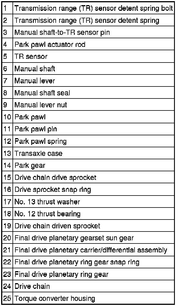 This transaxle has 3 planetary gearsets to provide operation in reverse and 6 forward speeds.The gearsets are comprised of the following components: