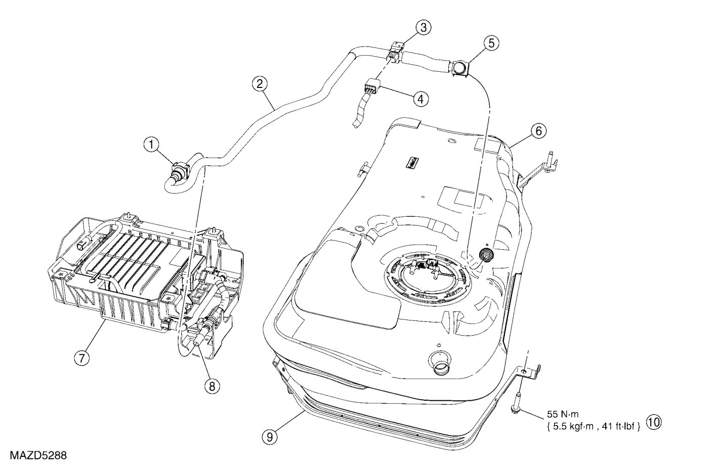 5. Partially lower the LH side of the fuel tank enough to access the fuel vapor tube assembly.