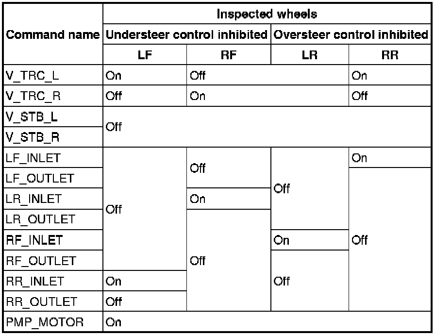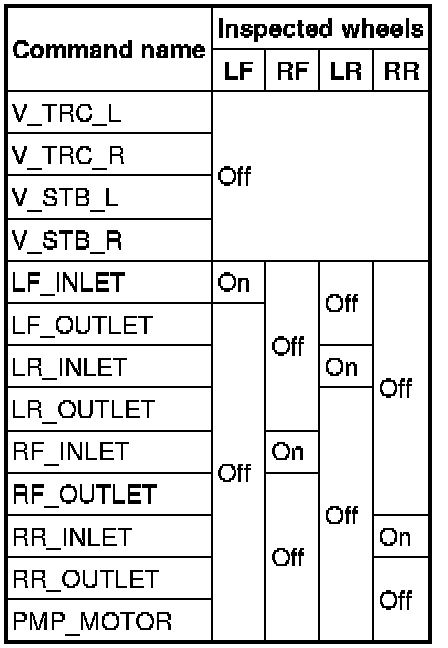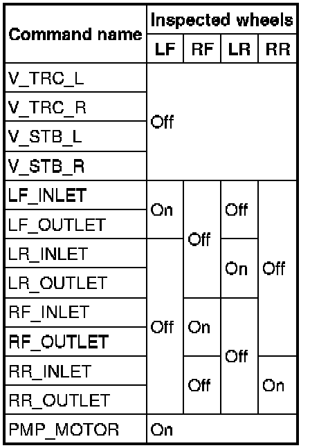 3. Set up an active command mode inspection according to the combination of commands below. Brake pressure retention
