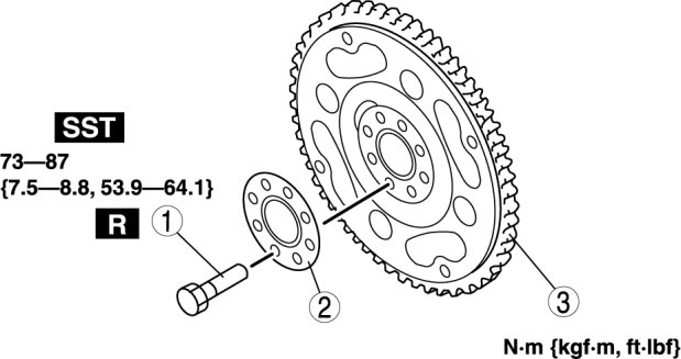 5. Tighten the new drive plate mounting bolts in two or three steps in the order shown.