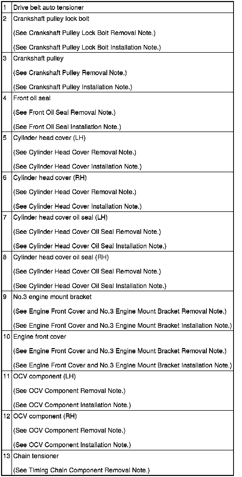- The following procedure "TIMING CHAIN REMOVAL/INSTALLATION" is performed after the engine and transaxle component is removed from the vehicle. Removal and Replacement