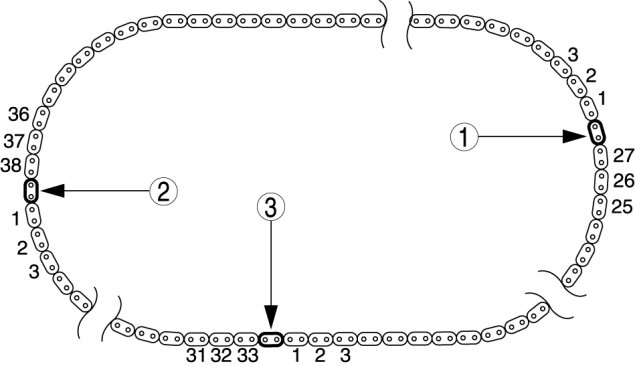 - When the timing chain is replaced with a new one, mark the new timing chain at the same positions as the removed timing chain.