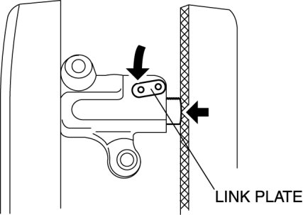 7. Insert an approx. 1.5 mm {0.059 in} thick wire or paper clip where the link plate hole and the tensioner body hole overlap to fix the link plate and lock the plunger.