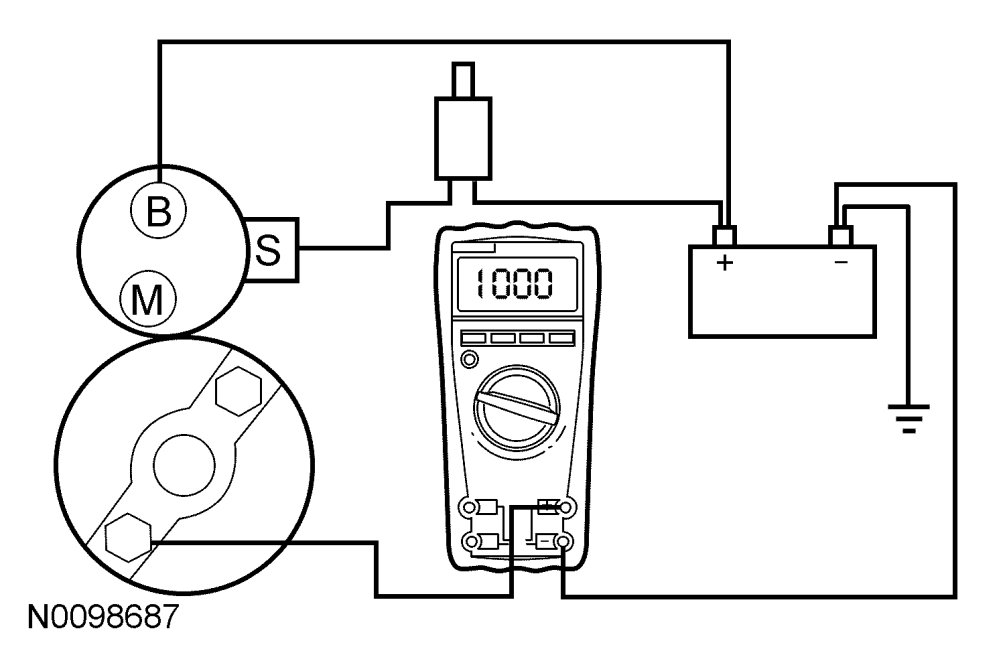 1. Connect the Digital Multimeter positive lead to the starter motor housing (the connection must be clean and free of rust or grease). Connect the negative lead to the negative (-) battery terminal.