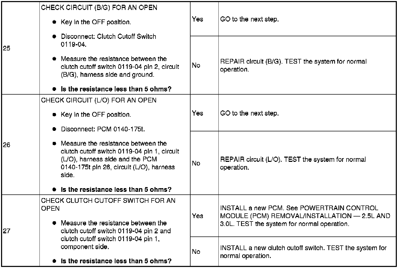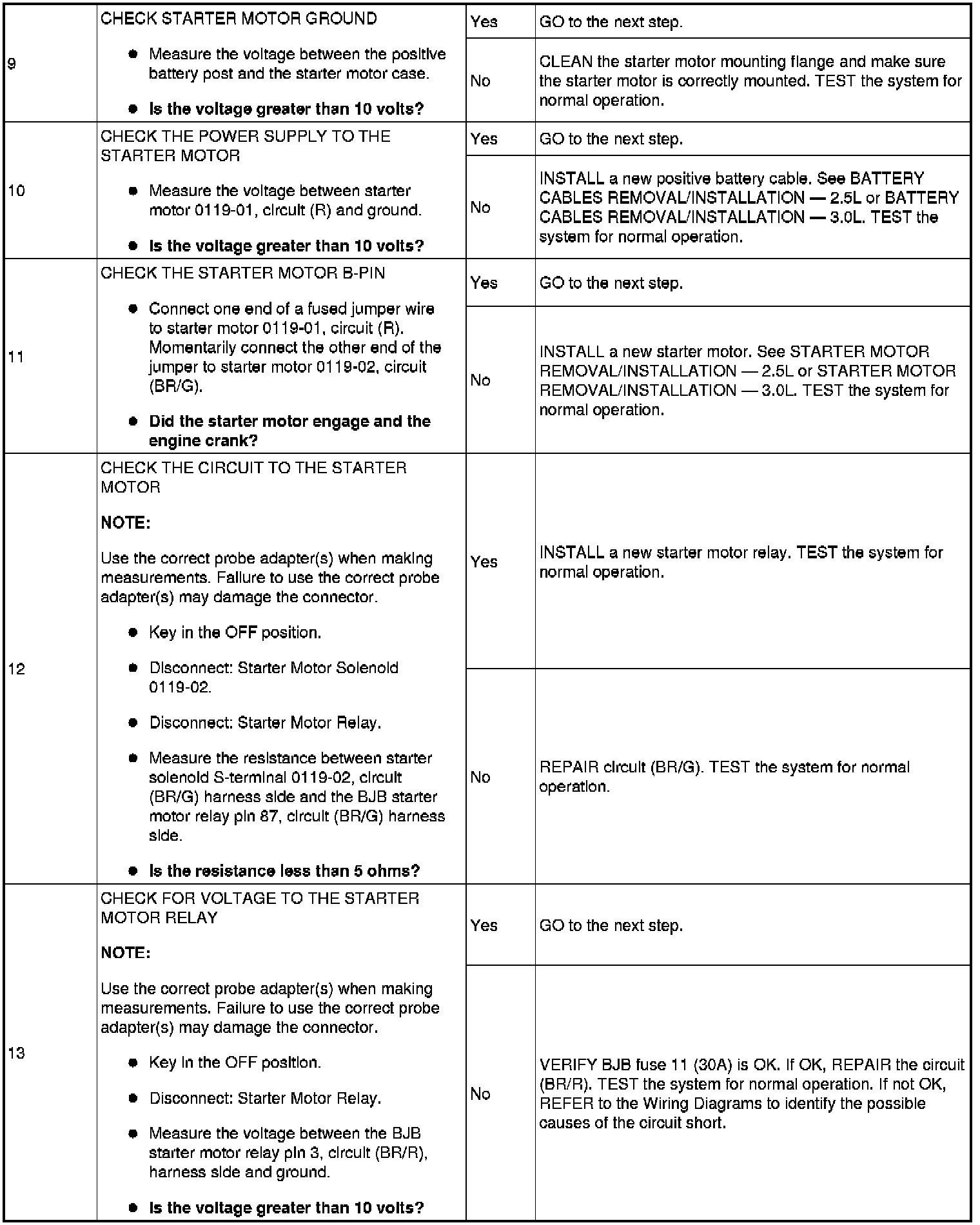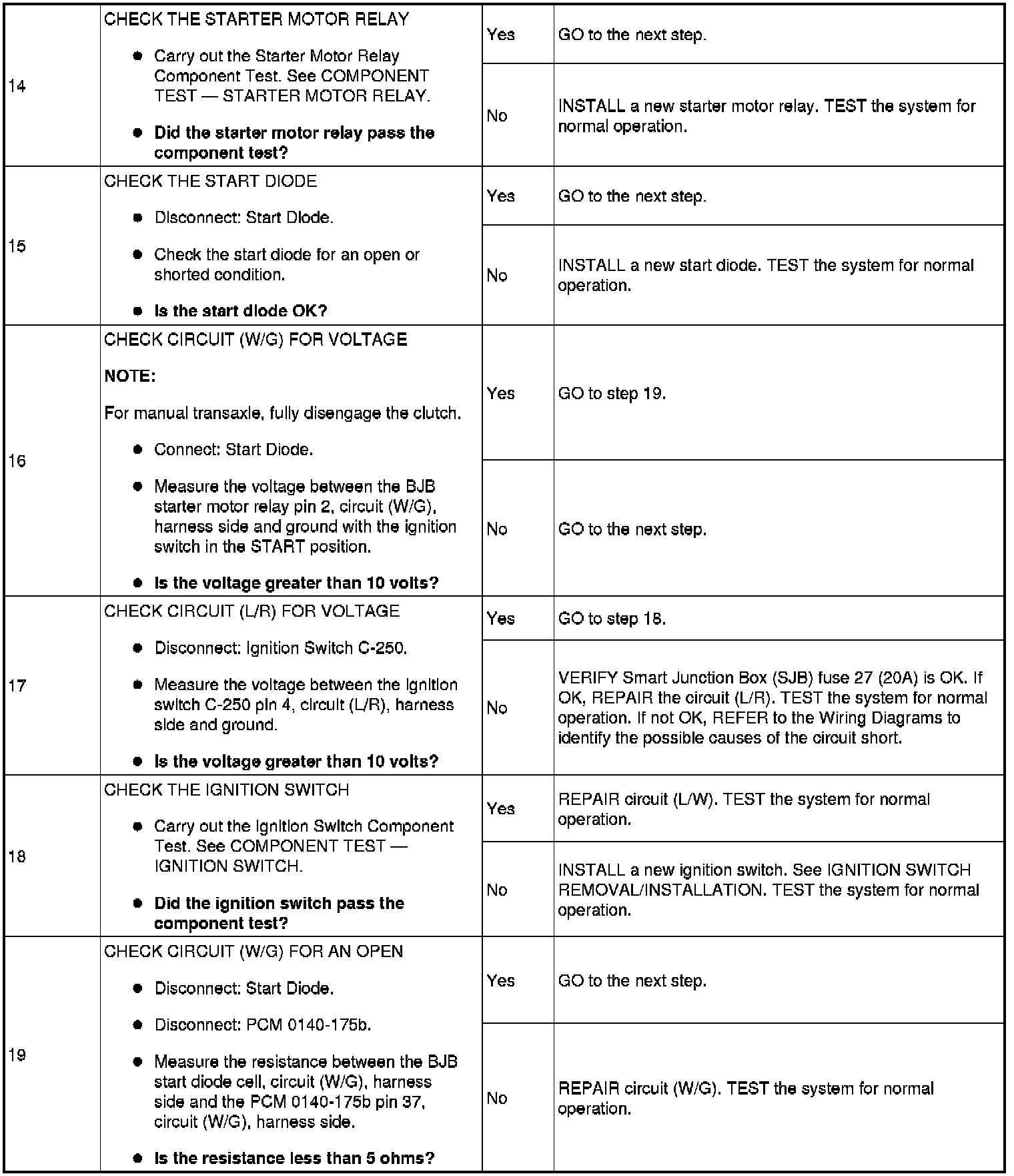 The Battery Junction Box (BJB) supplies constant power to the starter motor relay on circuit (L/R) through fuse 11 (30A). On vehicles with automatic transaxles, when the key is placed in the START position with the vehicle in PARK or NEUTRAL, the Transmission Range (TR) sensor sends a signal to the PCM and provides ground to the starter motor relay. On vehicles with manual transaxles, when the key is placed in the START position with the clutch pedal depressed, the clutch cutoff switch sends a signal to the PCM and provides ground to the starter motor relay. This allows power to be supplied from the starter motor relay contacts which then flows through circuit (BR/G) to the starter solenoid. The solenoid is grounded at the starter motor. Energizing the starter solenoid will engage the starter drive into the ring gear and closes the solenoid contacts, allowing power directly from the battery through circuit (R) to the starter motor to start the engine.