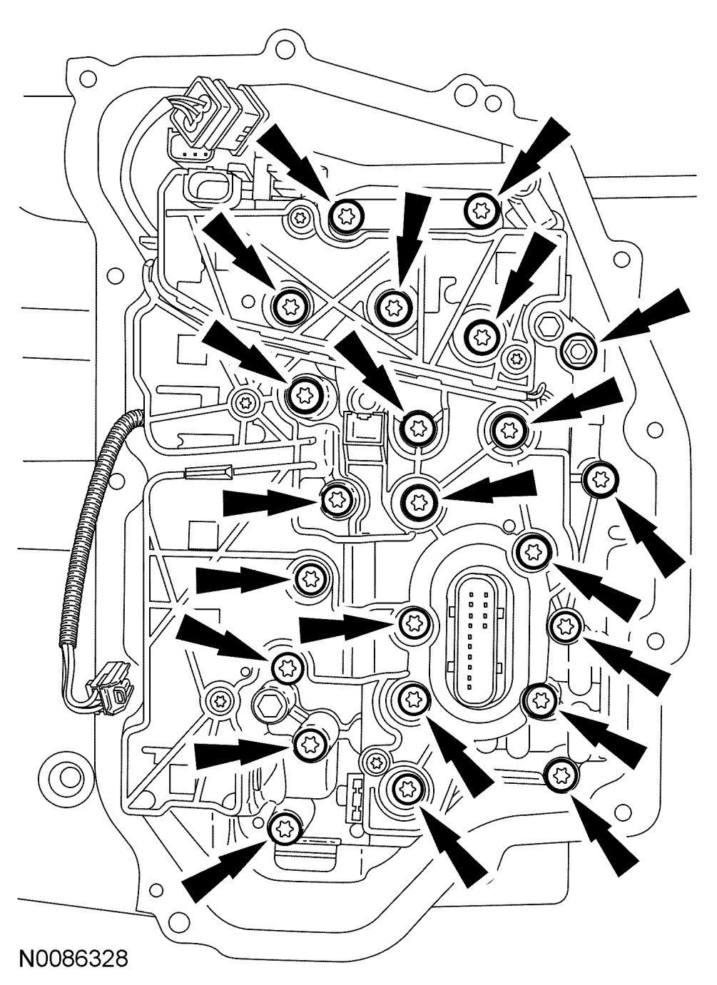 25. Install the solenoid body onto the main control valve body. Install the 2 bolts.