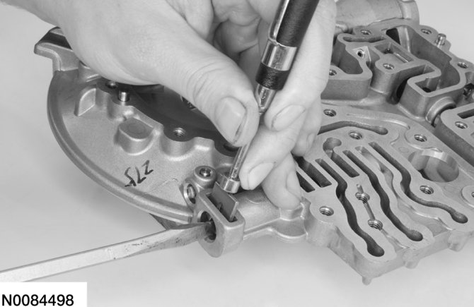 13. Compress the TCC control valve spring with a screwdriver and remover the retainer with a magnet.