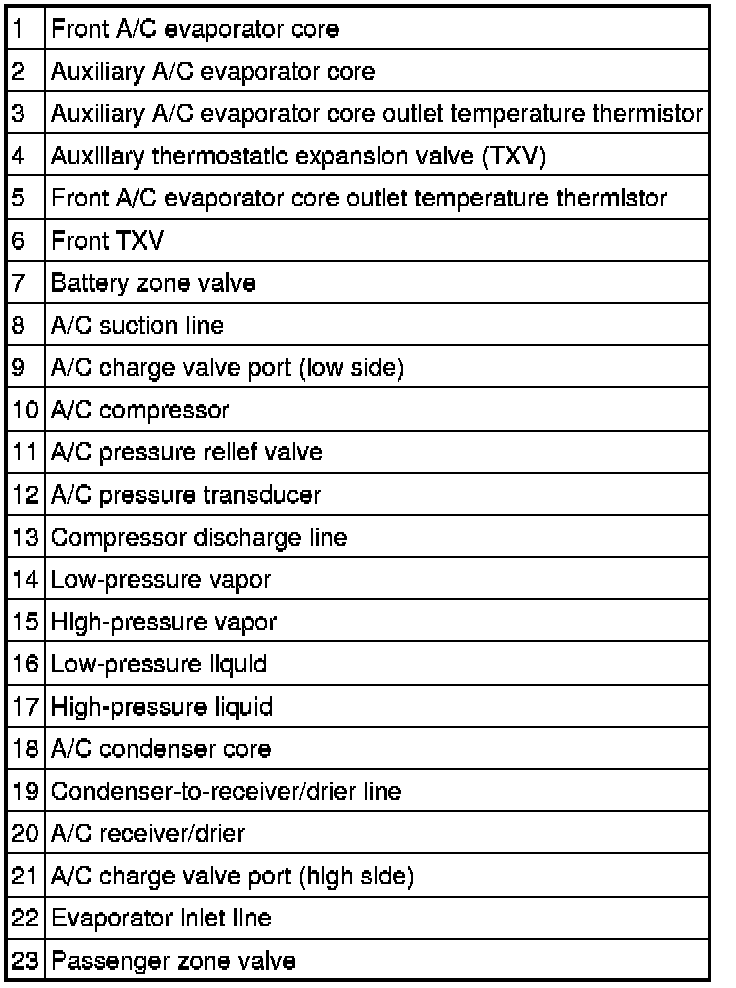 During stabilized conditions (air conditioning system shutdown), the refrigerant pressures are equal throughout the system. When the A/C compressor is in operation, it increases pressure on the refrigerant vapor, raising its temperature. The high-pressure and high-temperature vapor is then released into the top of the A/C condenser core.The A/C condenser, being close to ambient temperature, causes the refrigerant vapor to condense into a liquid when heat is removed from the refrigerant by ambient air passing over the fins and tubing. The now liquid refrigerant, still at high pressure, exits from the bottom of the A/C condenser and enters the inlet side of the A/C receiver/drier. The receiver/drier is designed to remove moisture from the refrigerant.The outlet of the receiver/drier is connected to the thermostatic expansion valve (TXV). The TXV provides the orifice, which is the restriction in the refrigerant system, and separates the high- and low-pressure sides of the A/C system. As the liquid refrigerant passes across this restriction, its pressure and boiling point are reduced.The liquid refrigerant is now at its lowest pressure and temperature. As it passes through the A/C evaporator, it absorbs heat from the airflow passing over the plate/fin sections of the A/C evaporator. This addition of heat causes the refrigerant to boil (convert to gas). The now cooler air can no longer support the same humidity level of the warmer air. This excess moisture condenses on the exterior of the evaporator coils and fins and drains outside the vehicle.