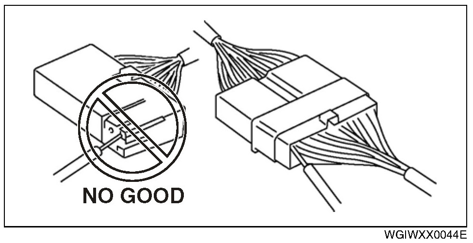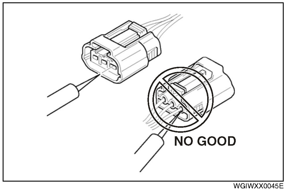 - When a tester is used to inspect for continuity or measuring voltage, insert the tester probe from the wiring harness side.