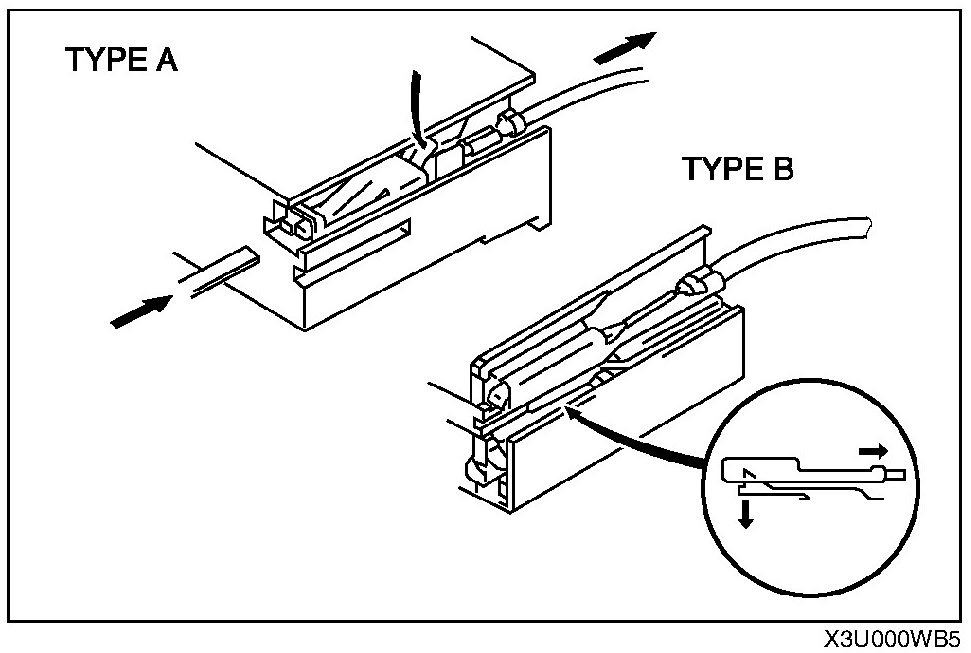 - Use the appropriate tools to remove a terminal as shown. When installing a terminal, be sure to insert it until it locks securely.