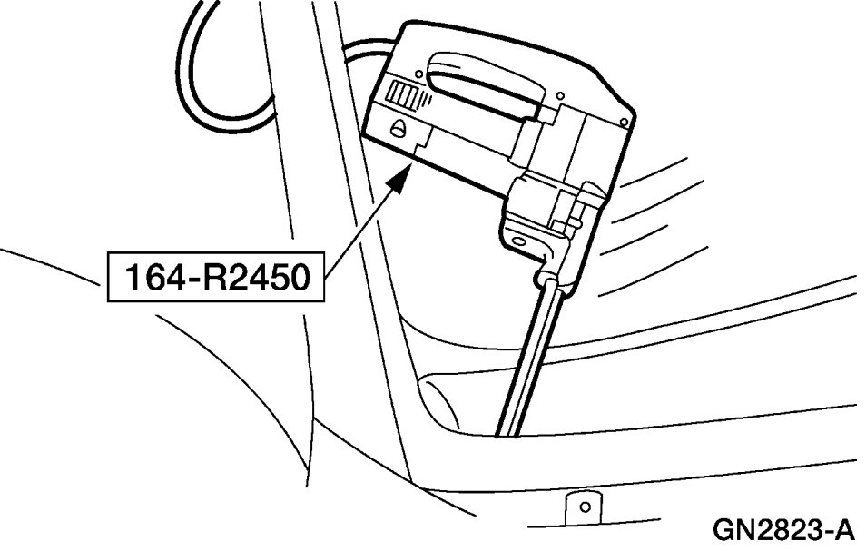 9. Using the special tool, cut the urethane adhesive from the windshield glass starting at the top center and working toward the bottom corners.