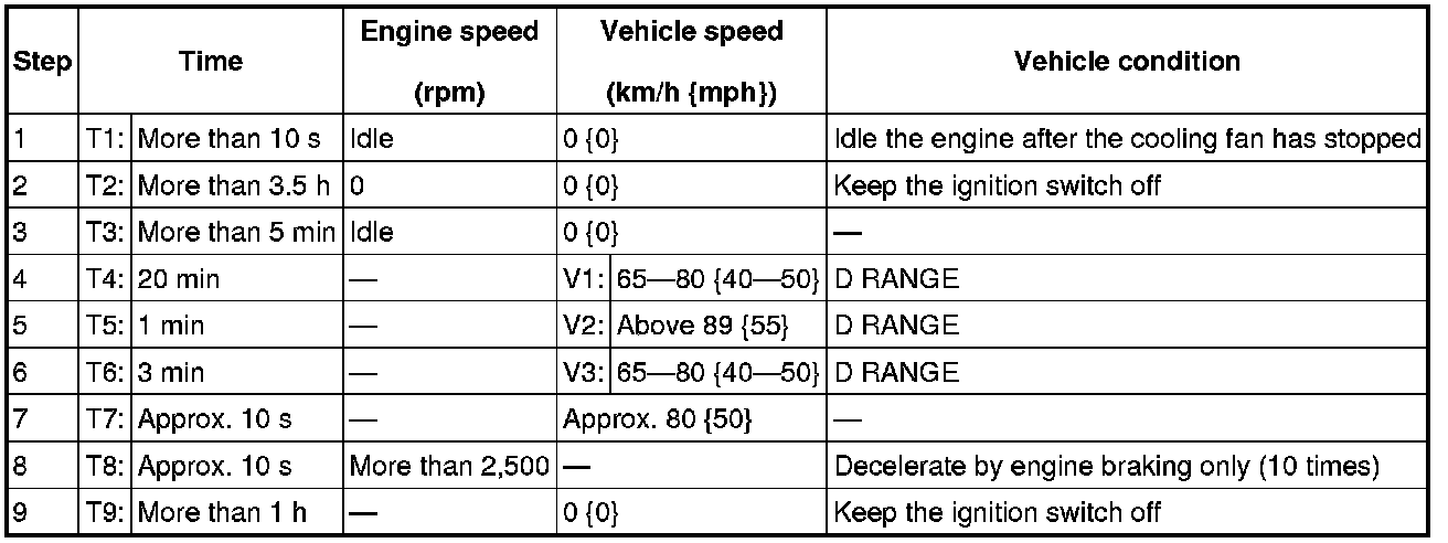 7. Drive the vehicle with D range at an engine speed of 68-77 km/h {42-48 mph}for more than 20 min.