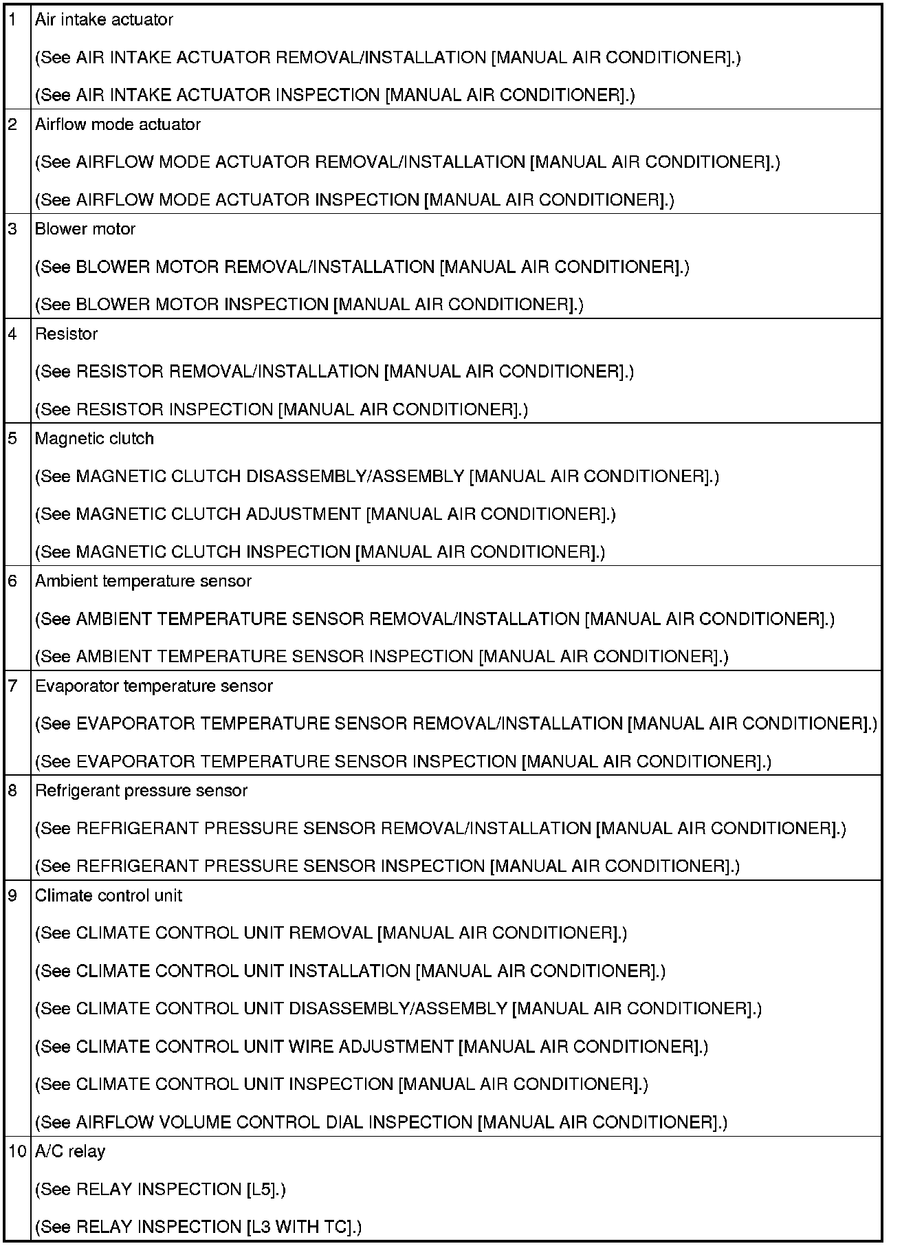 HVAC CONTROL SYSTEM LOCATION INDEX [MANUAL AIR CONDITIONER]