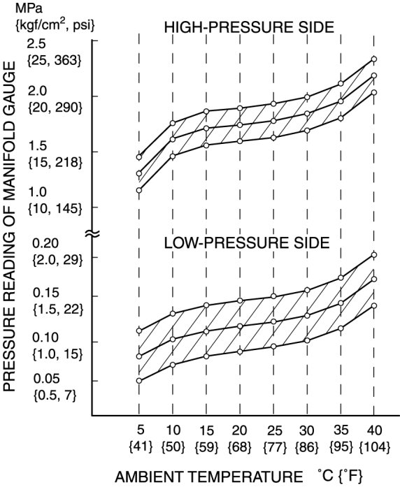 10. Verify that the intersection of the pressure reading of the manifold gauge and ambient temperature is in the shaded zone.