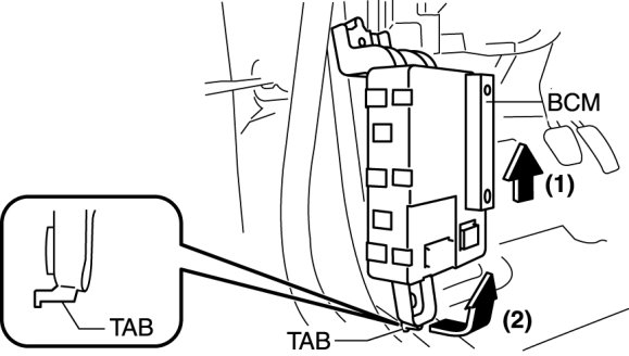 8. Raise the BCM in the direction of the arrow (1) shown in the figure, pull it in the direction of the arrow (2), and remove the tab from the body.