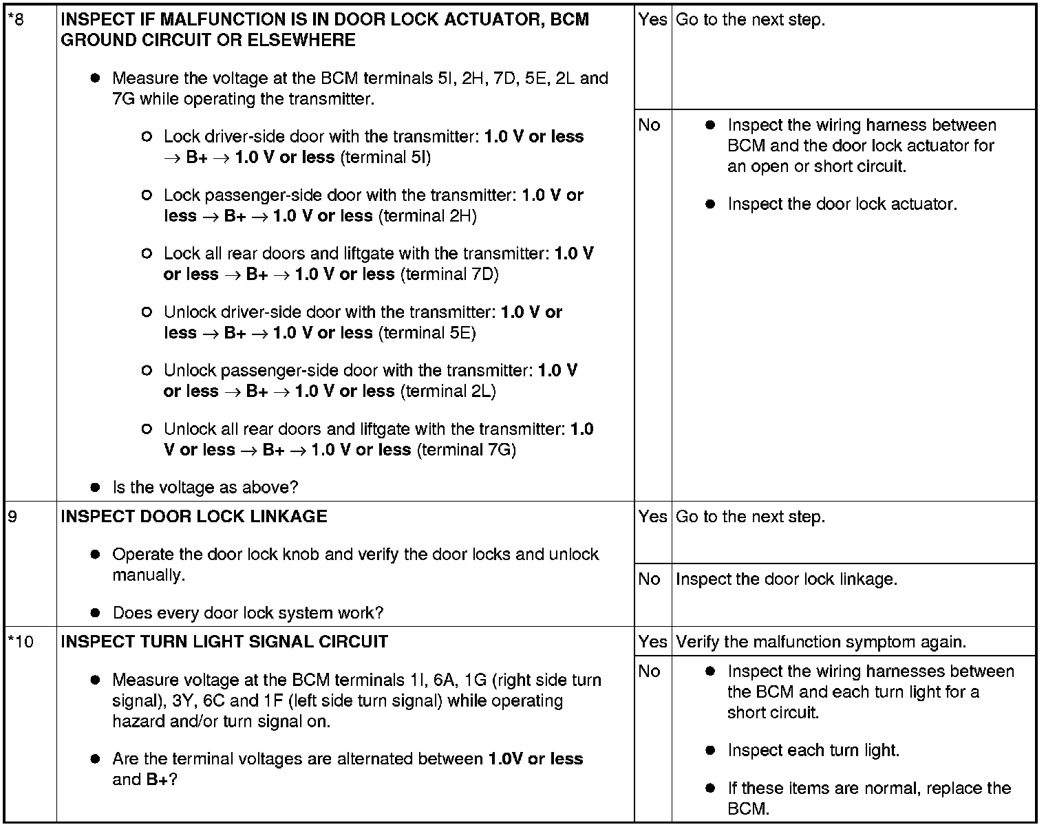 - When performing an asterisked (*) troubleshooting inspection, slightly shake the wiring harness and connectors while performing the inspection to discover whether poor contact points are the cause of any intermittent malfunctions. If there is a problem, verify that the connectors, terminals and wiring harnesses are connected correctly and undamaged.