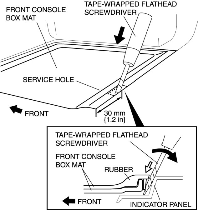 1. Insert a tape-wrapped flathead screwdriver between the indicator panel and front console box mat.
