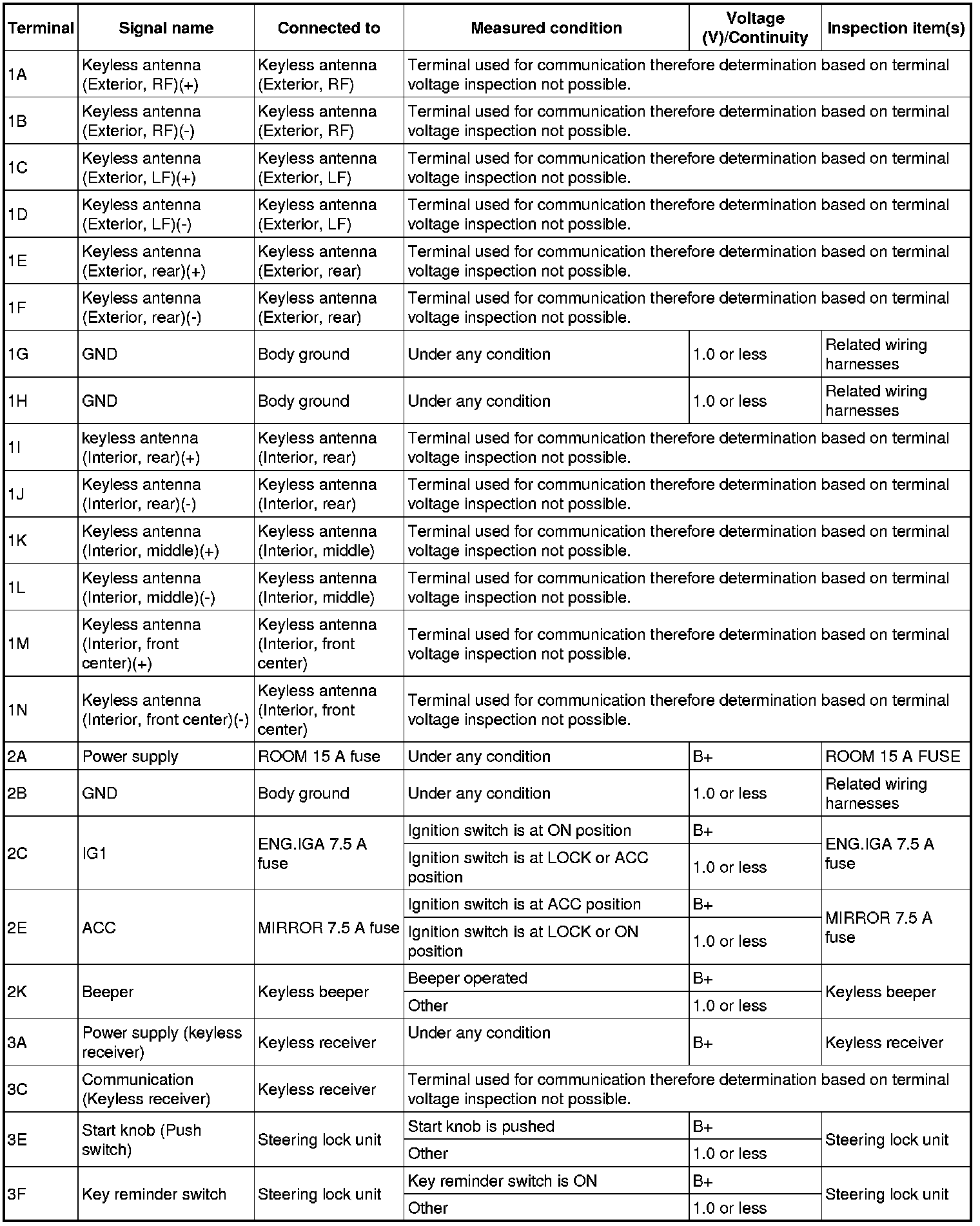 1. Measure the voltage or inspect for continuity according to the Terminal Voltage Table (Reference).