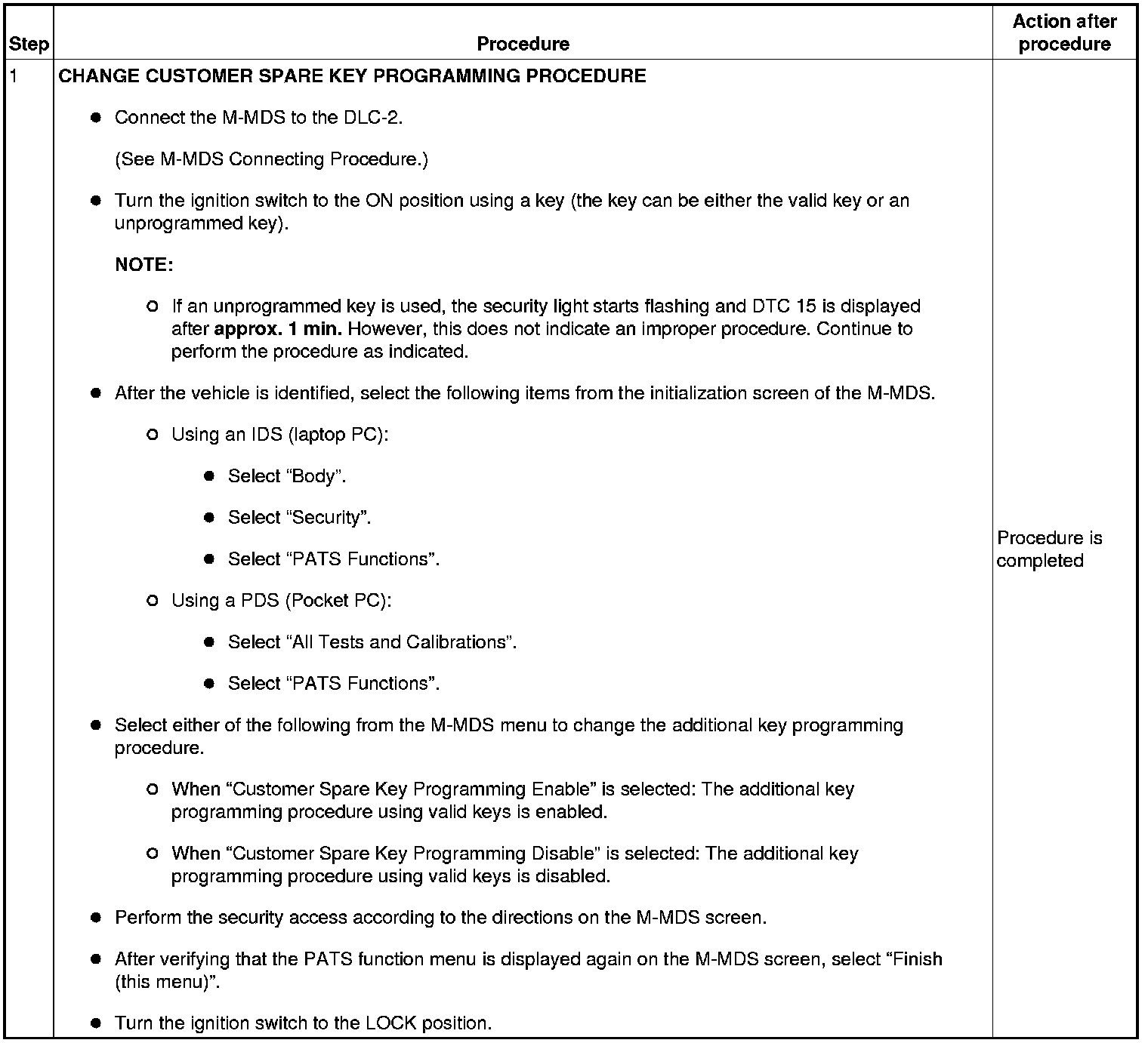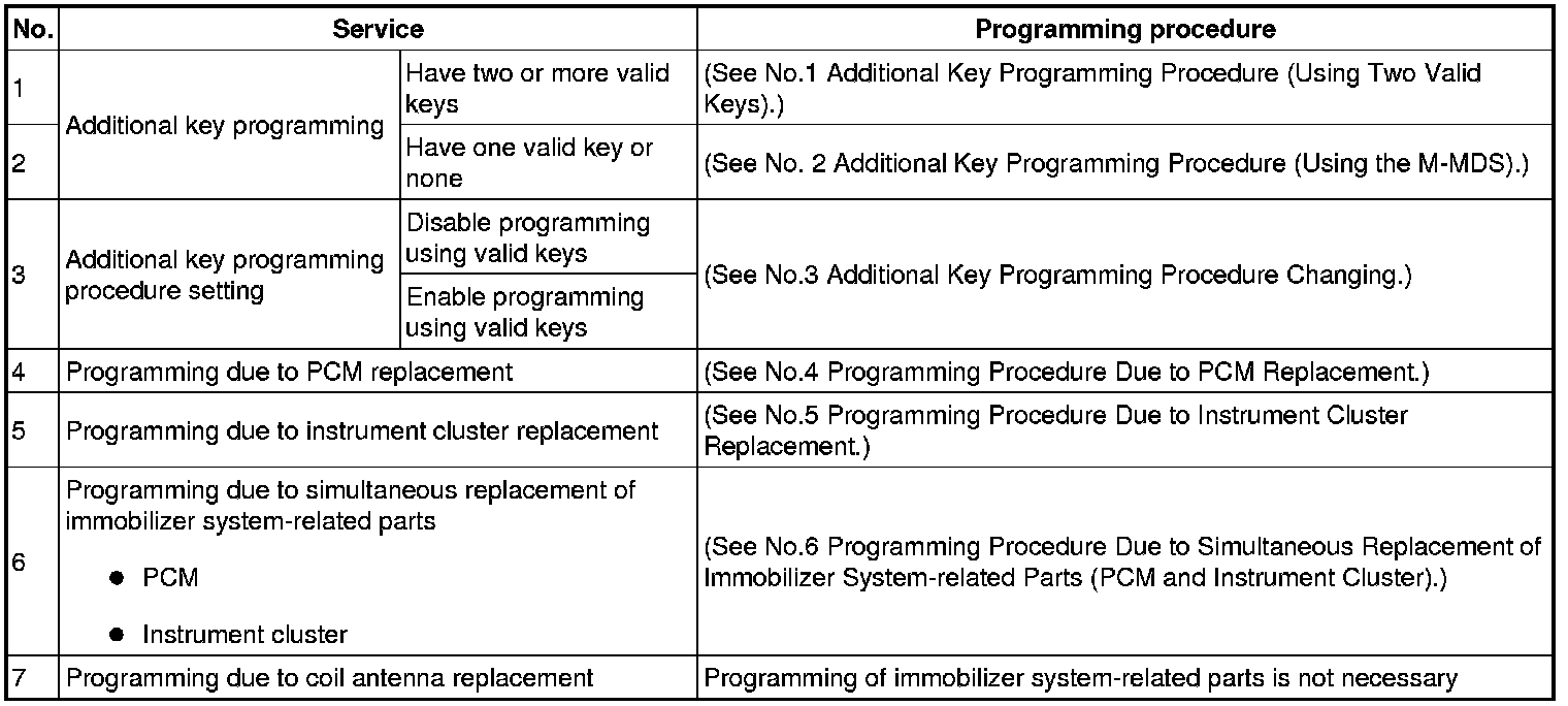Immobilizer System-Related Parts Service and Programming Procedure Table