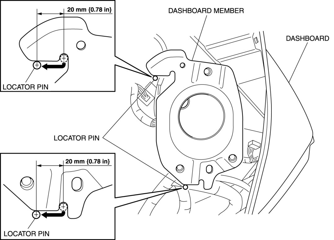 21. Lift the dashboard upward and move it 20 mm {0.78 in} to the rear of the vehicle after the locator pin for the dashboard member is in the position shown in the figure.