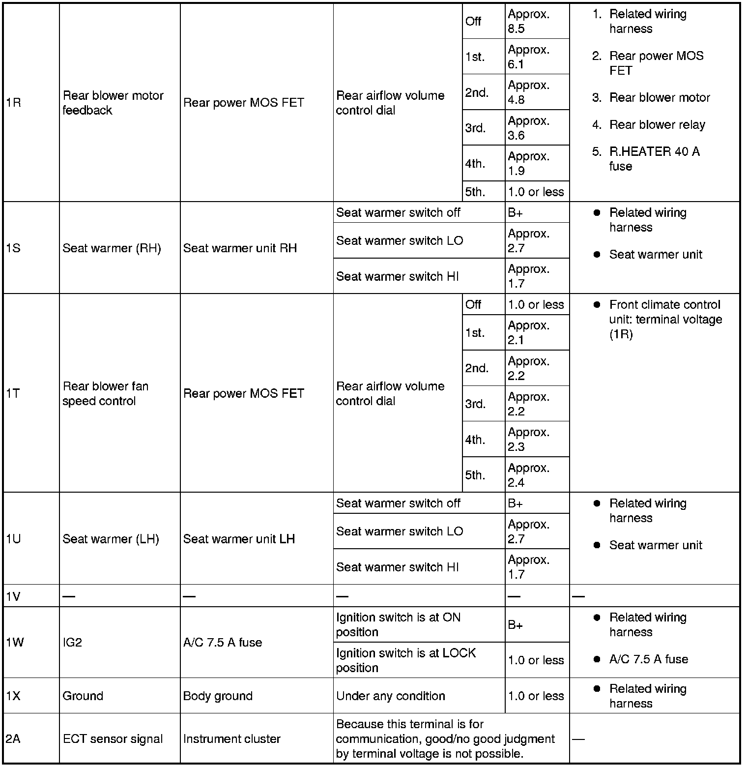 4. By inserting the positive (+) lead of the tester into each front climate control unit terminal, measure the voltage according to the terminal voltage table.
