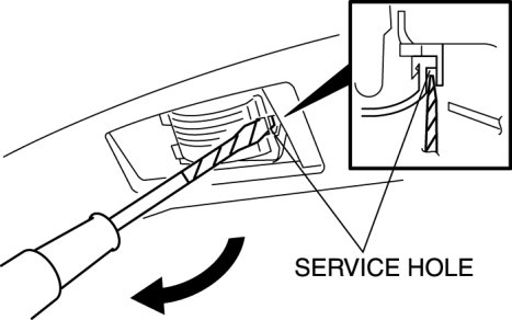 1. Insert a tape-wrapped flathead screwdriver into the service hole and pry with the screwdriver in the direction shown by the arrow to remove the lens.