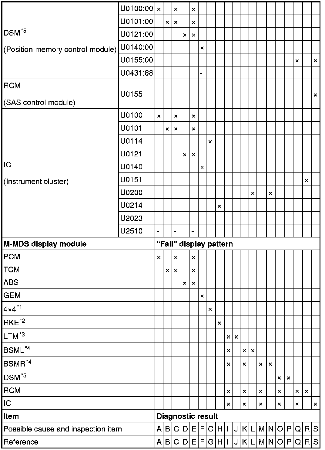 - A hyphen(-) in the DTC output pattern table indicates that the DTC may be displayed depending on the malfunction detection conditions. If only an (x) is indicated, it means the DTC will not be displayed.