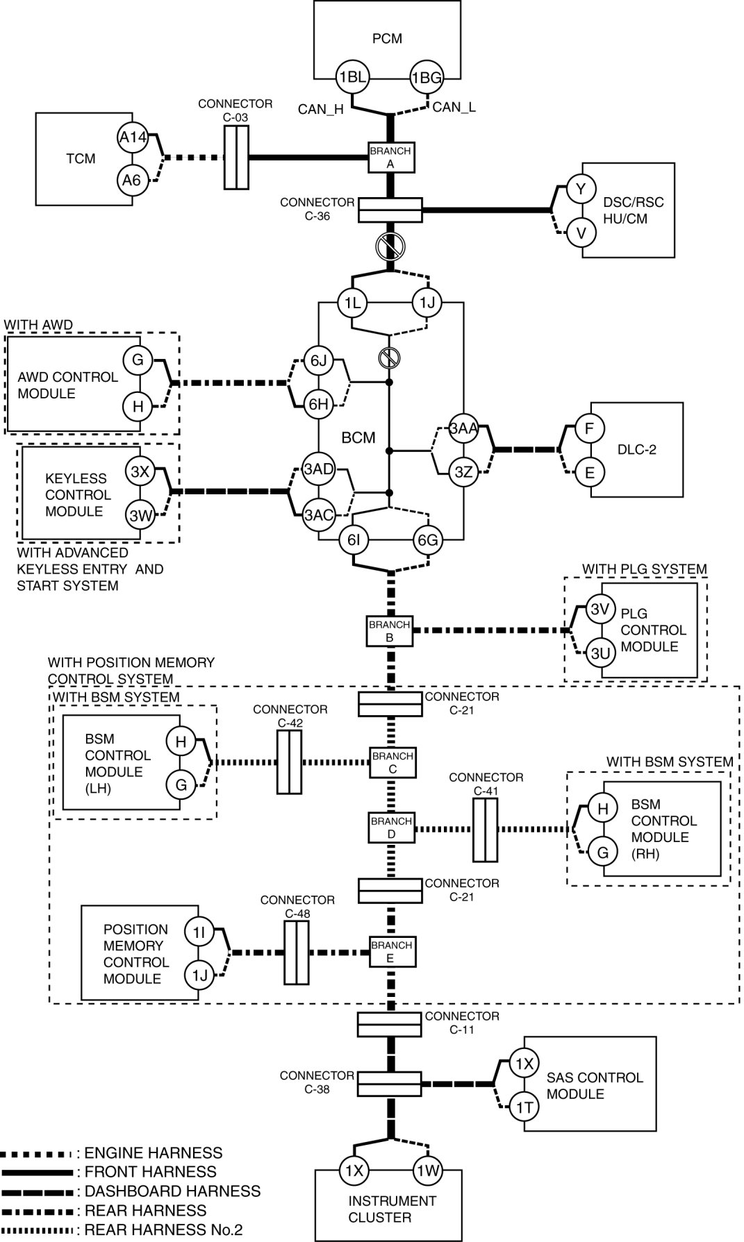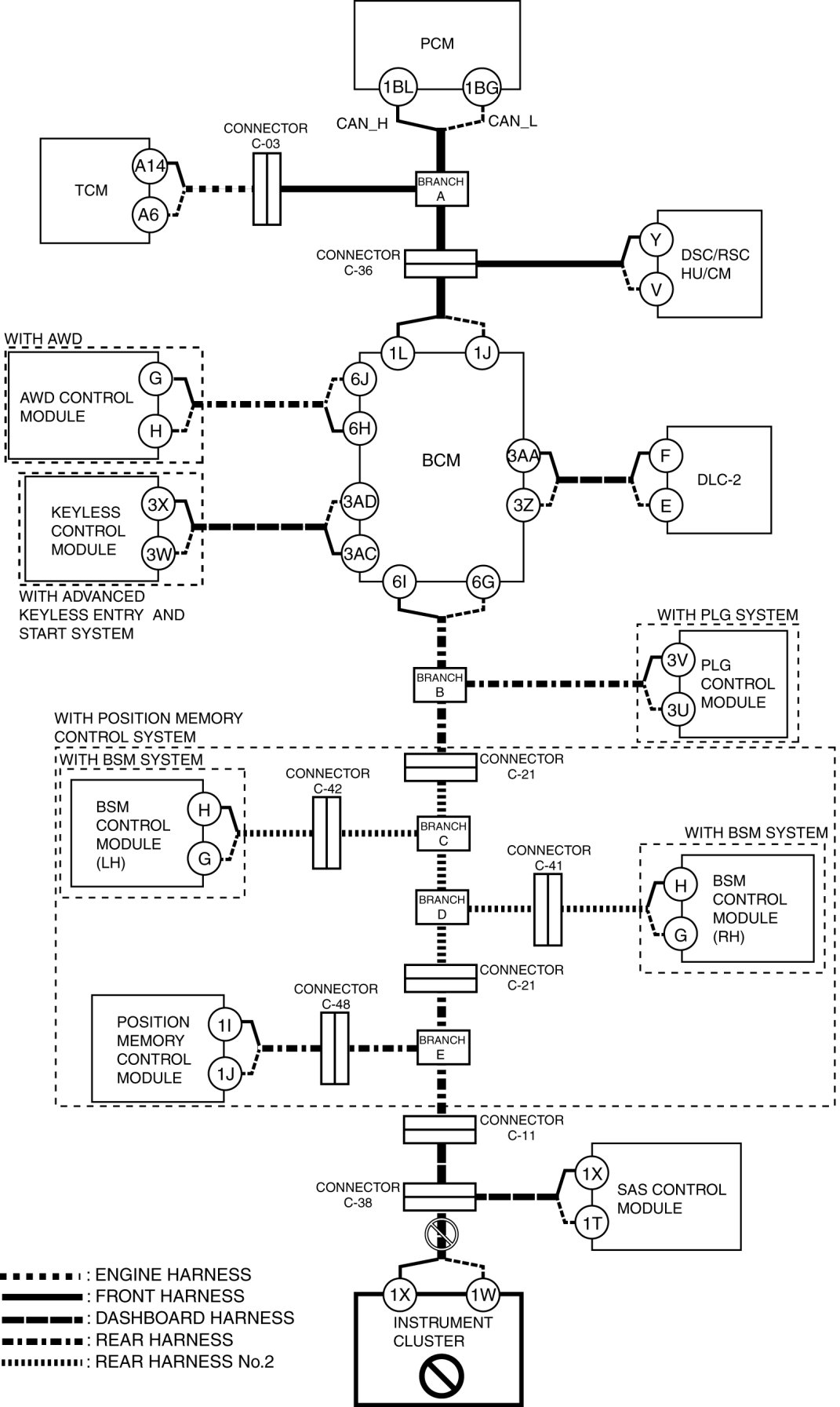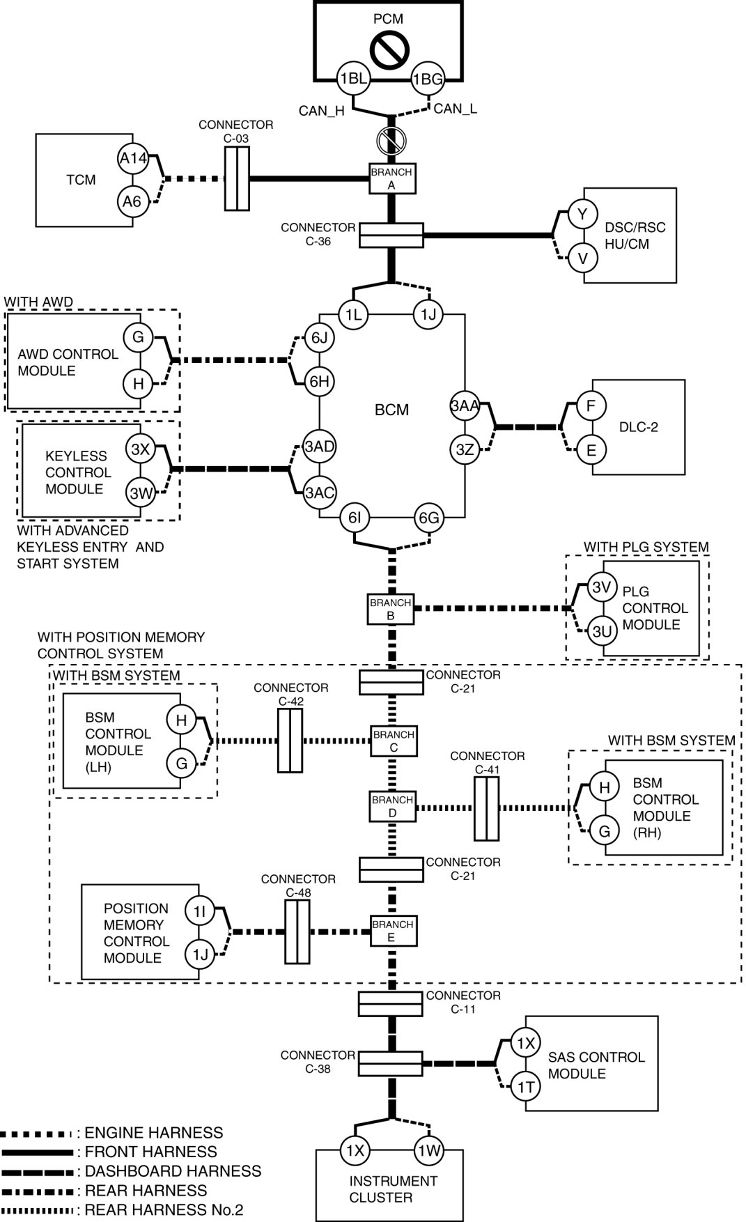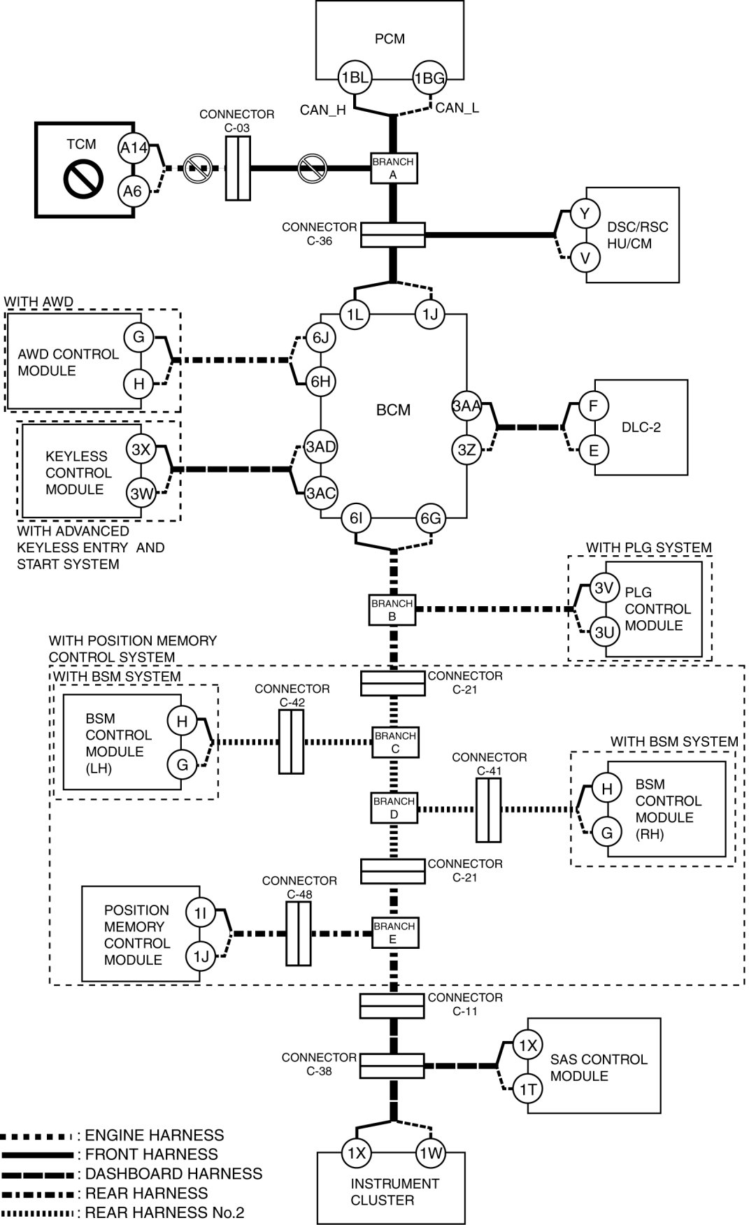 - Wiring harness between keyless control module terminal 3X and BCM terminal 3AD