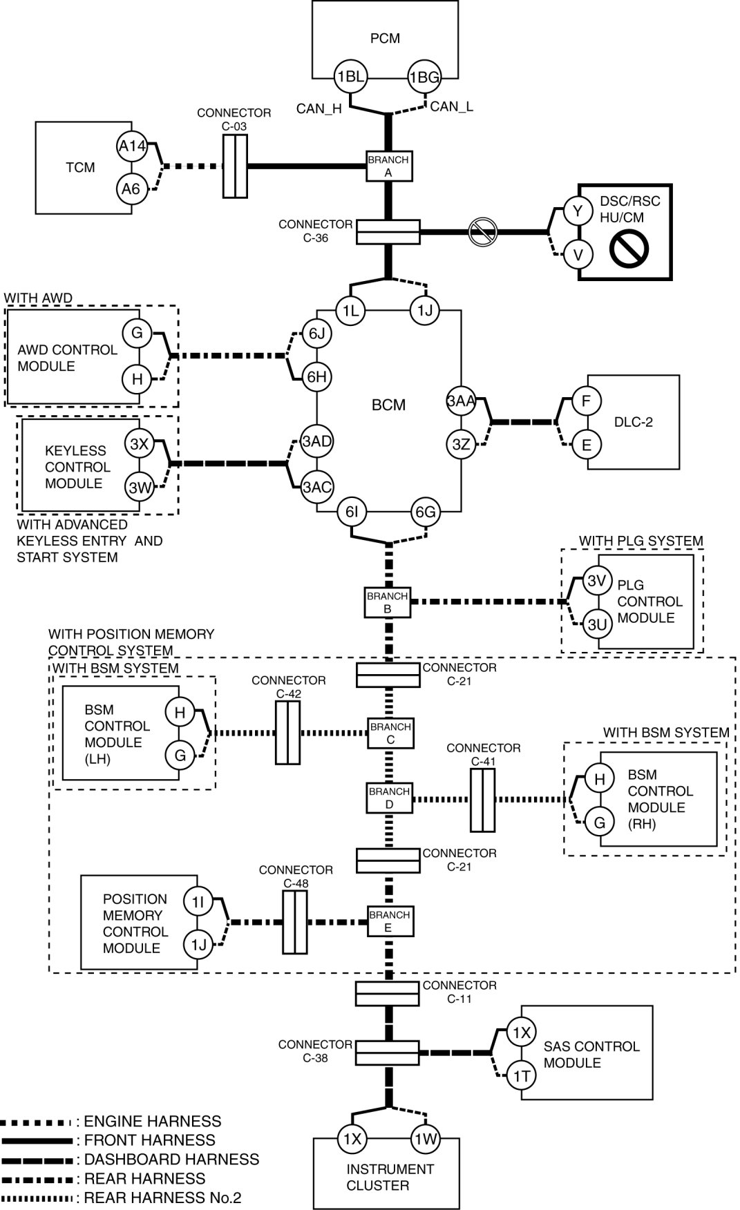 - Open circuit in wiring harness between DSC/RSC HU/CM and connector C-36